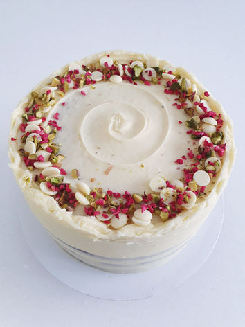 Delicate raspberry sponges sandwiched together with pistachio paste and a whipped white chocolate ganache for a semi naked finish
